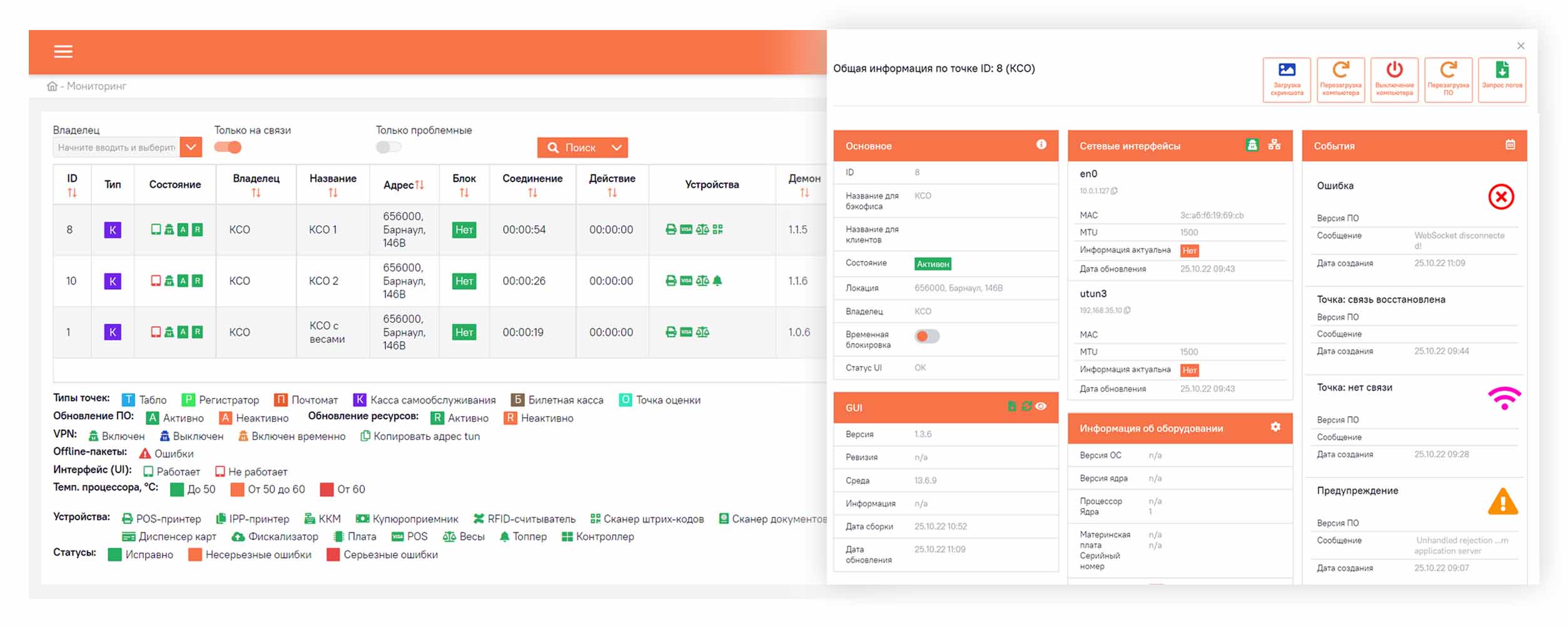 Наша команда накопила широчайший опыт по работе с крупными распределенными сетями устройств самообслуживания. Мы уделяем особое внимание отслеживанию работоспособности киосков и надежности решения.