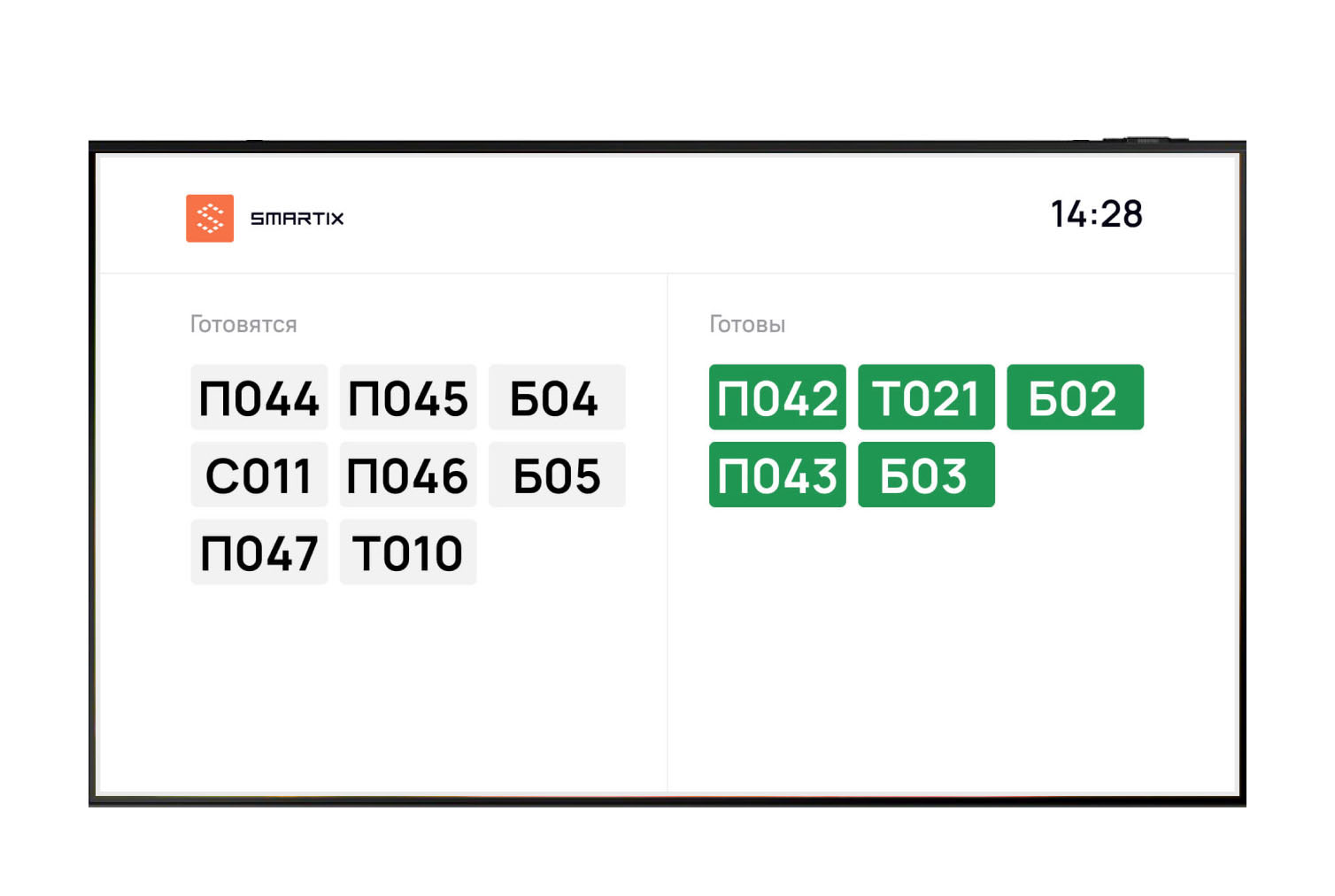 - Электронные табло для отображения статуса заказа в рамках нашей системы электронной очереди.
