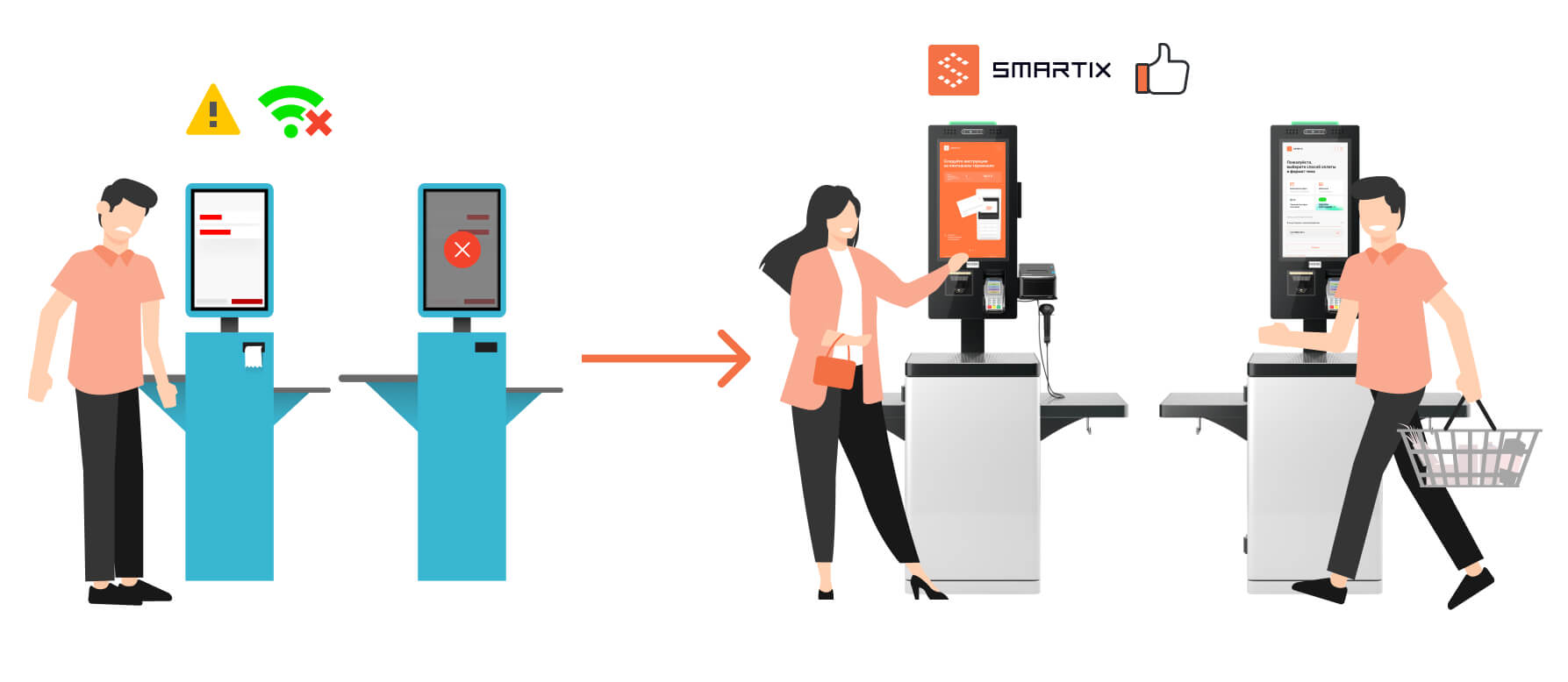 Если ваш магазин уже использует ПО для касс самообслуживания и вы рассматриваете переход на более гибкое, современное программное обеспечение для касс самообслуживания, наши специалисты легко и быстро переведут всю сеть на приложение для касс самообслуживания Smartix! Даже если устройства представлены сетью разрозненных касс с различным набором аппаратных компонентов.