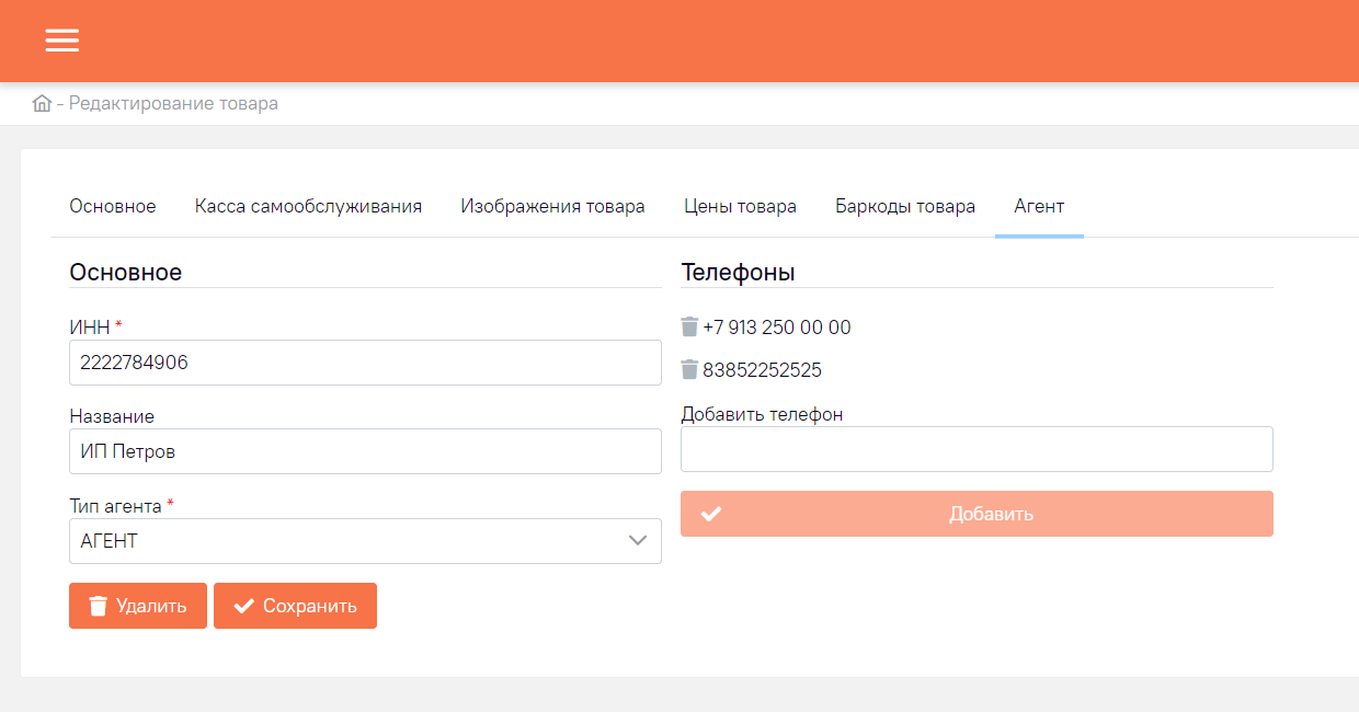 В бэк-офисе добавлена сущность агента, который впоследствии используется для привязки к нему товарных позиций. После продажи продукции агента прибыль от его товаров перечисляется на его счет, за вычетом агентского вознаграждения в пользу владельца касс самообслуживания. Поддерживается агентская фискализация и все виды контрольно-кассовой техники.