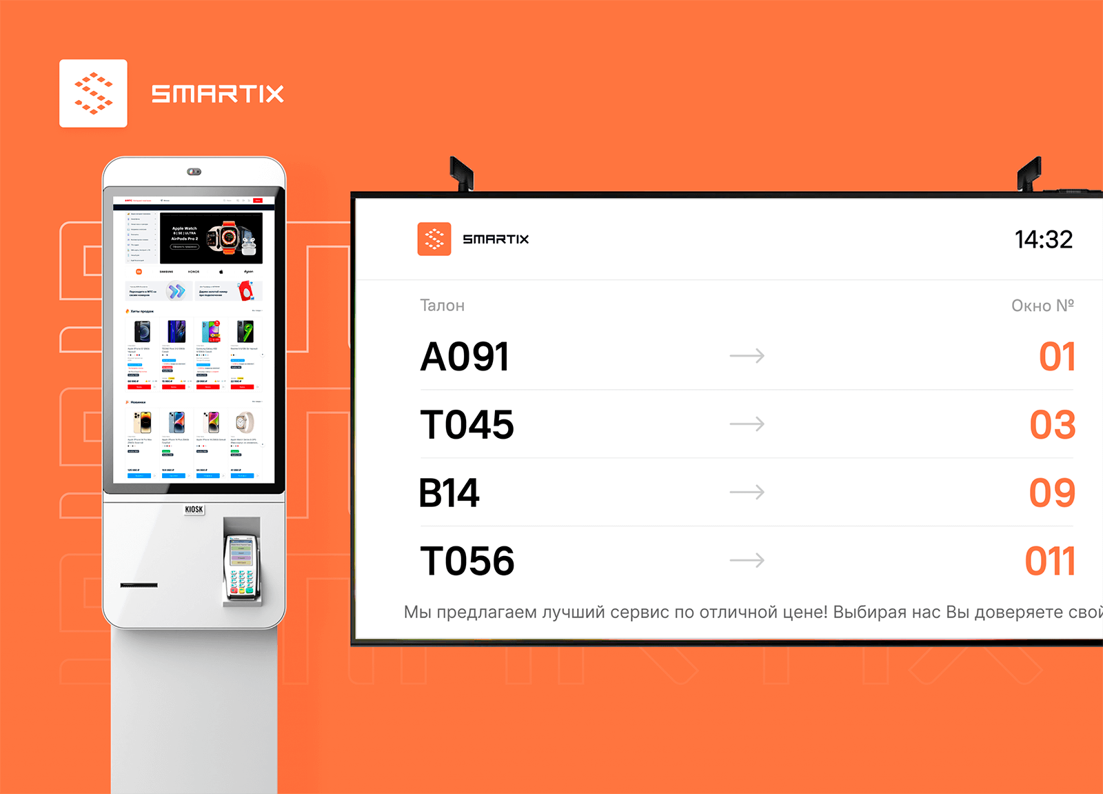 Выступая в качестве специализированного разработчика программного обеспечения для киосков самообслуживания и собственной Системы электронной очереди, компания Smartix предоставляет своим заказчикам возможность объединения двух решений в одном программно-аппаратном комплексе.