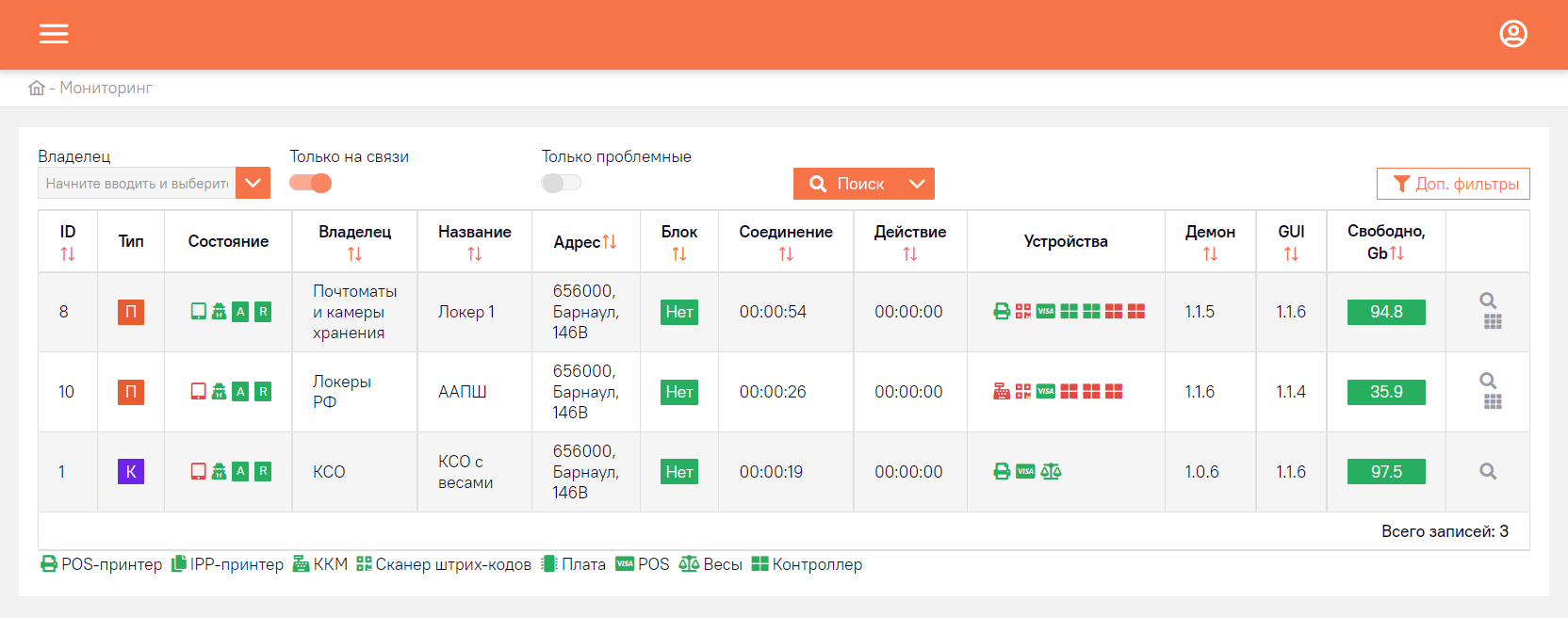 Теперь администратор системы может быстро получать наглядное представление о состоянии оборудования прямо на главном экране в колонке “Устройства”, без дополнительного открытия вкладок. Вся визуальная информация основана на иконках, которые отражают различные компоненты — ККМ, POS-терминалы, сканеры штрихкодов, контроллеры замков, принтеры, платы, весы.