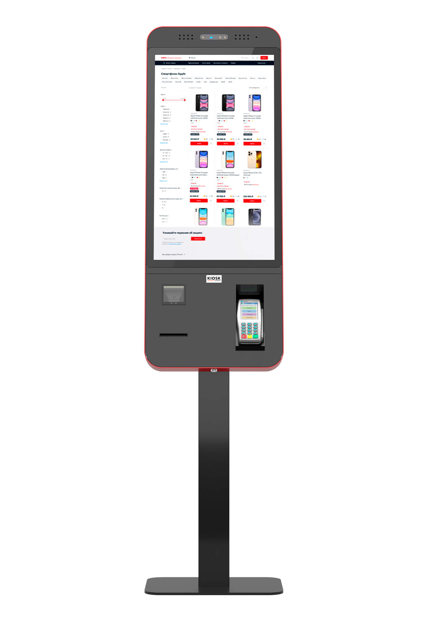 Современные интерактивные панели на базе киосков самообслуживания Smartix, на которых развернут весь виртуальный каталог онлайн-магазина сотового оператора.